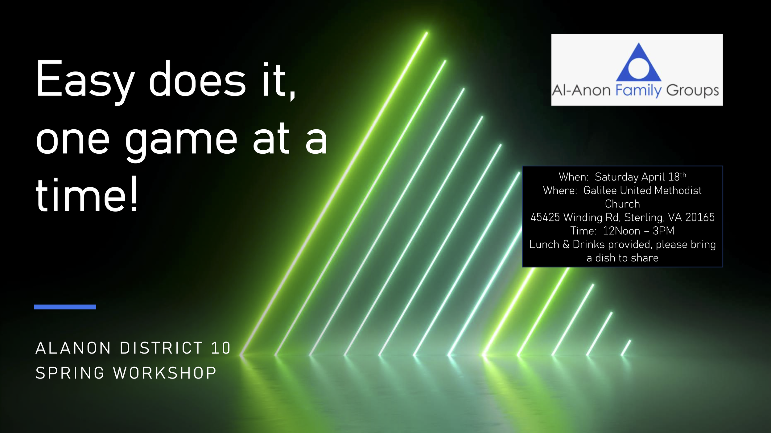 Easy Does It: One Game at a Time Workshop Saturday, April 18, 2026 12:00 PM 3:00 PM 12:00 15:00 Google Calendar ICS Saturday, April 1812-3 pm at Galilee United Methodist Church 45425 Winding Rd, Sterling, VA 20165